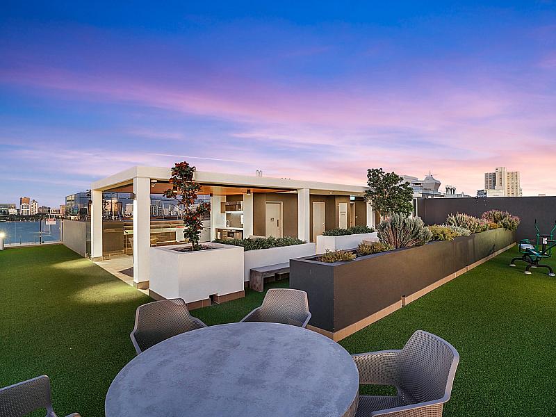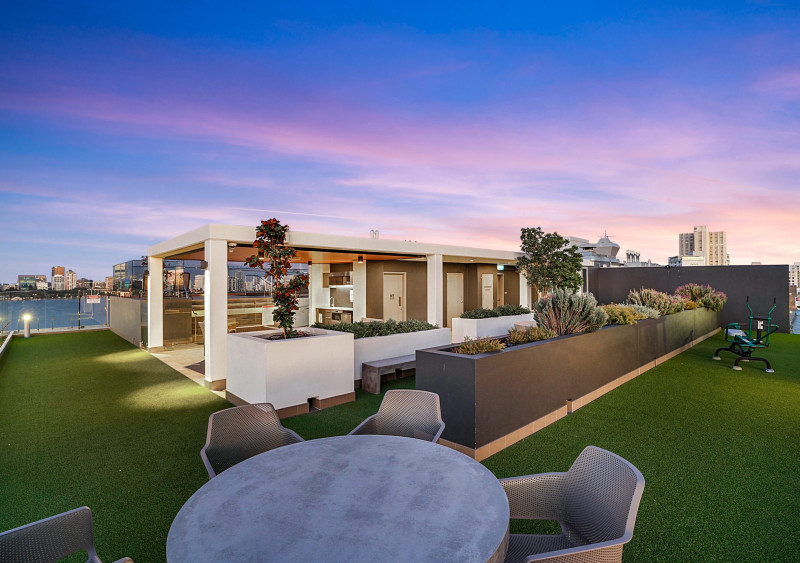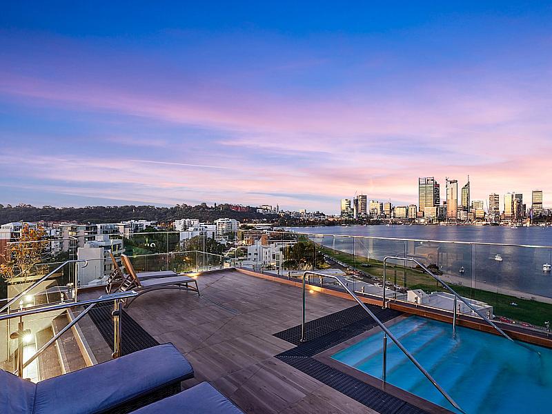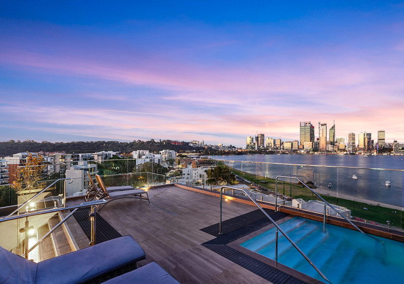 The rooftop pool and entertainment deck offers a heated pool, bbq area and sweeping views of the Swan River, Kings Park along with the shimmering lights of Perth City.